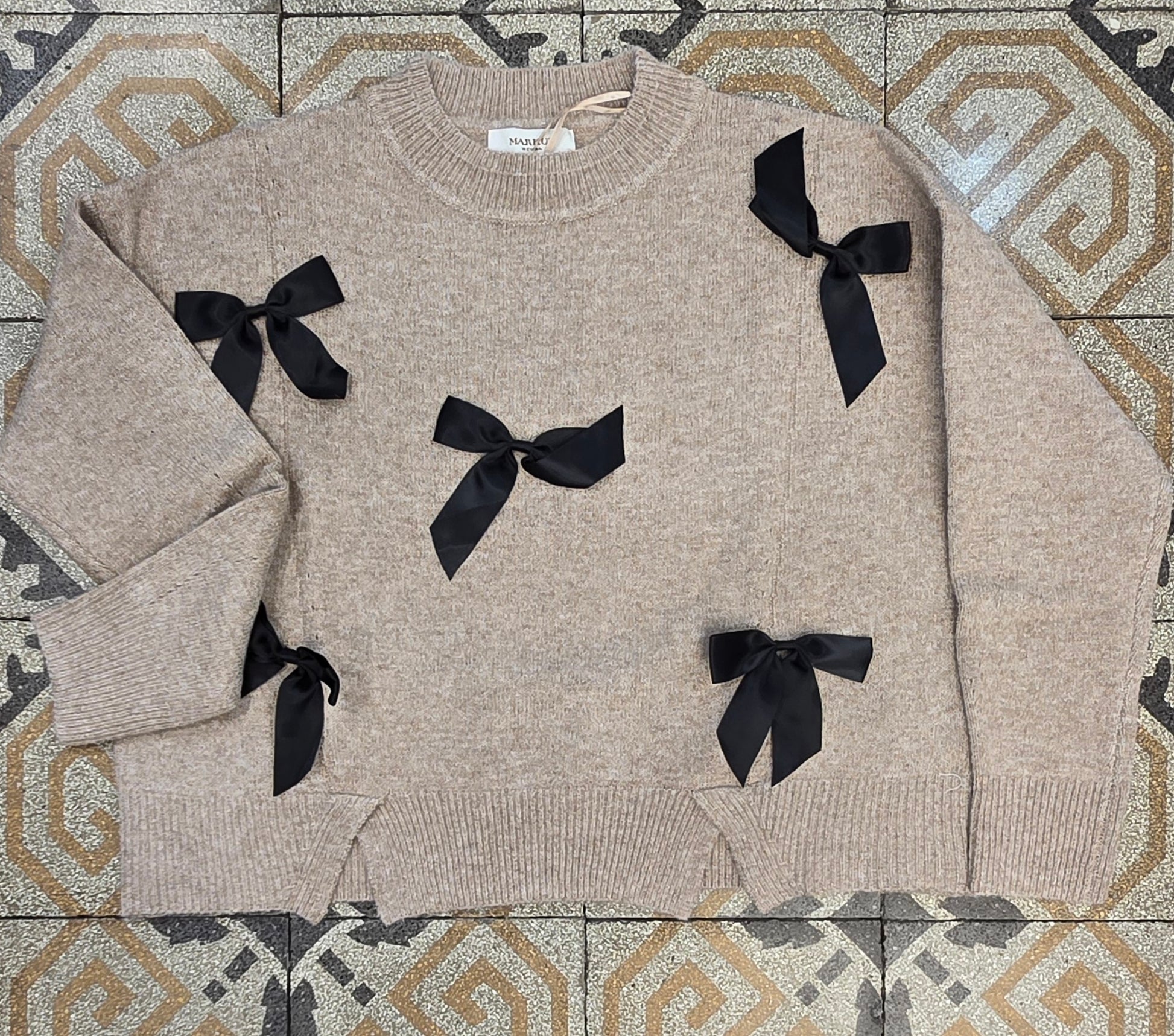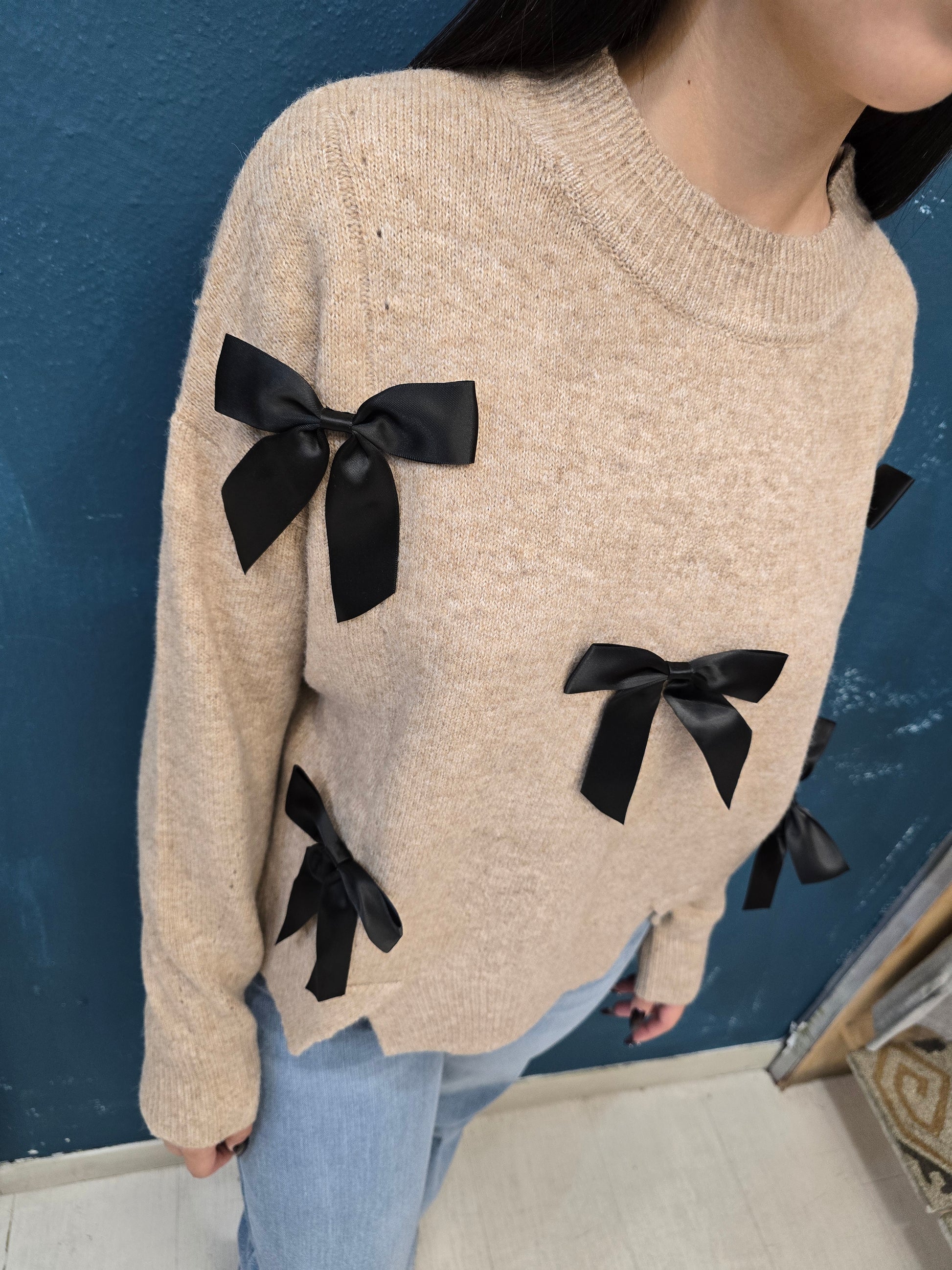 Maglia corta e larga camel con applicazione fiocchi in raso davanti.