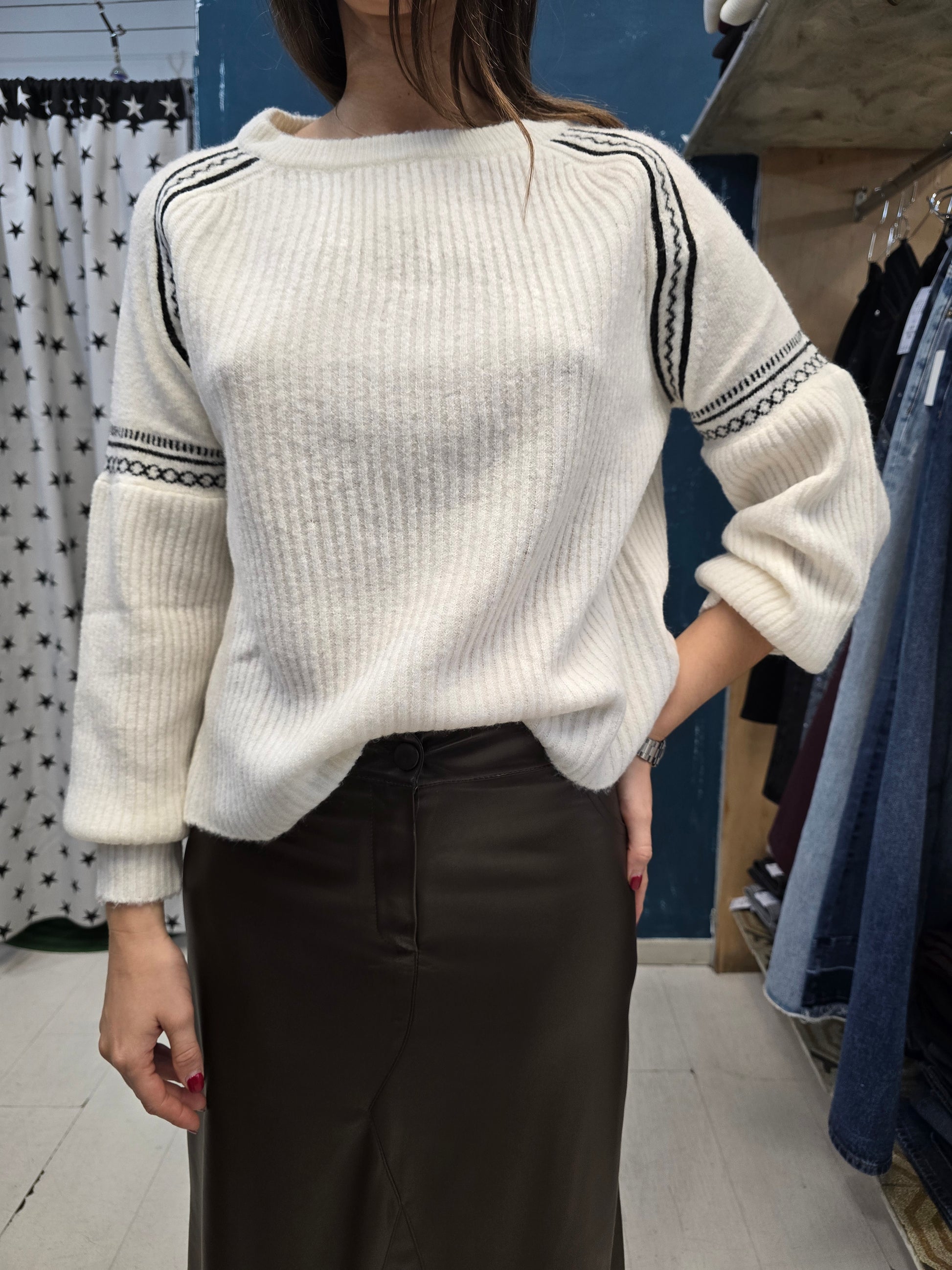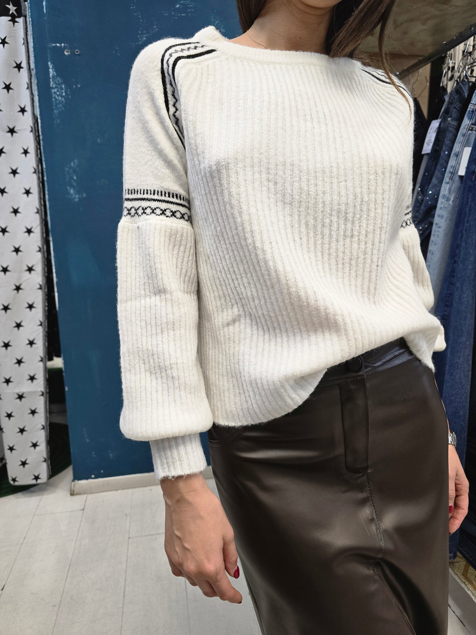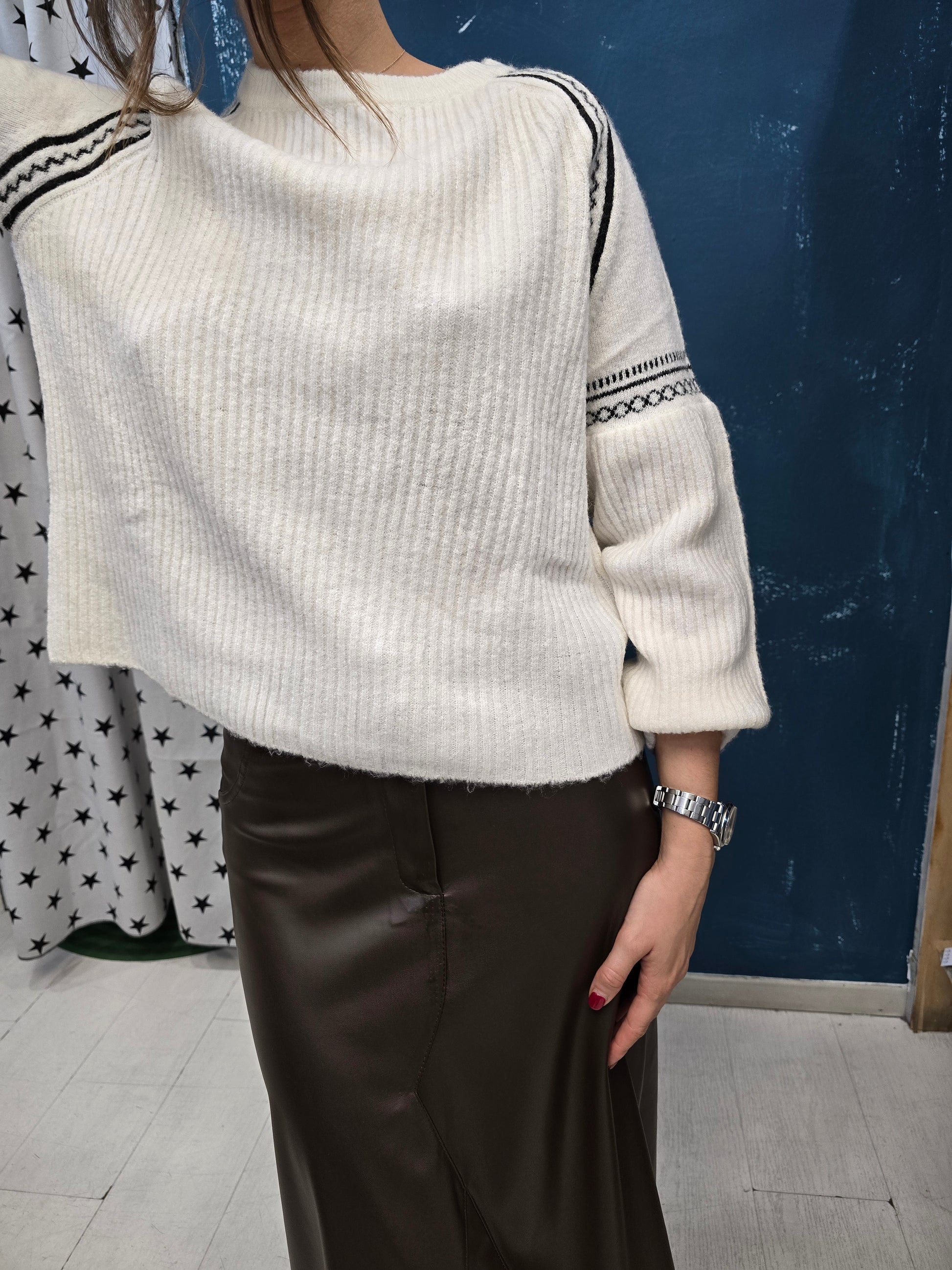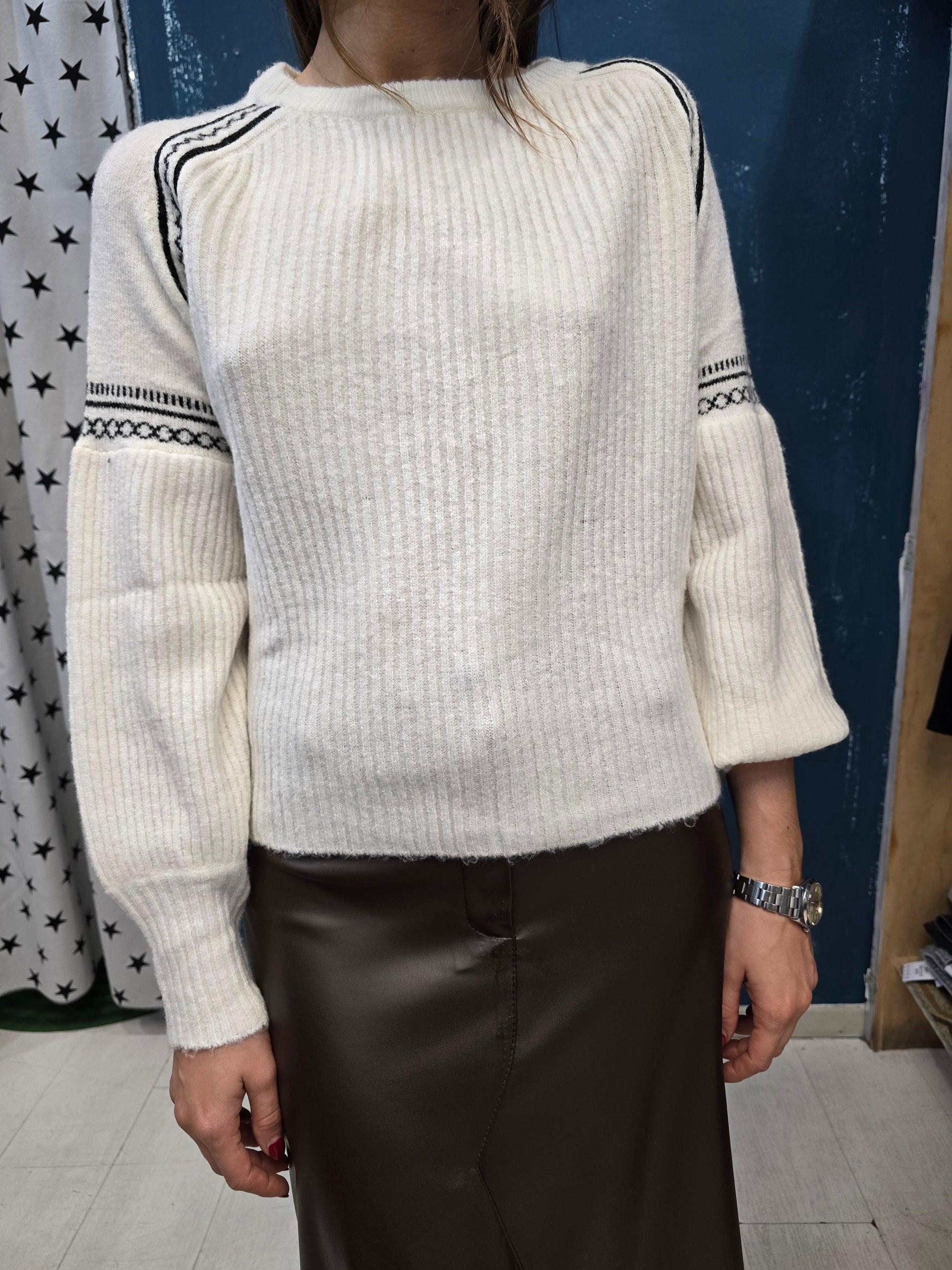 Maglia paricollo bianca a costa larga con manica bombata e greca di rifinitura.