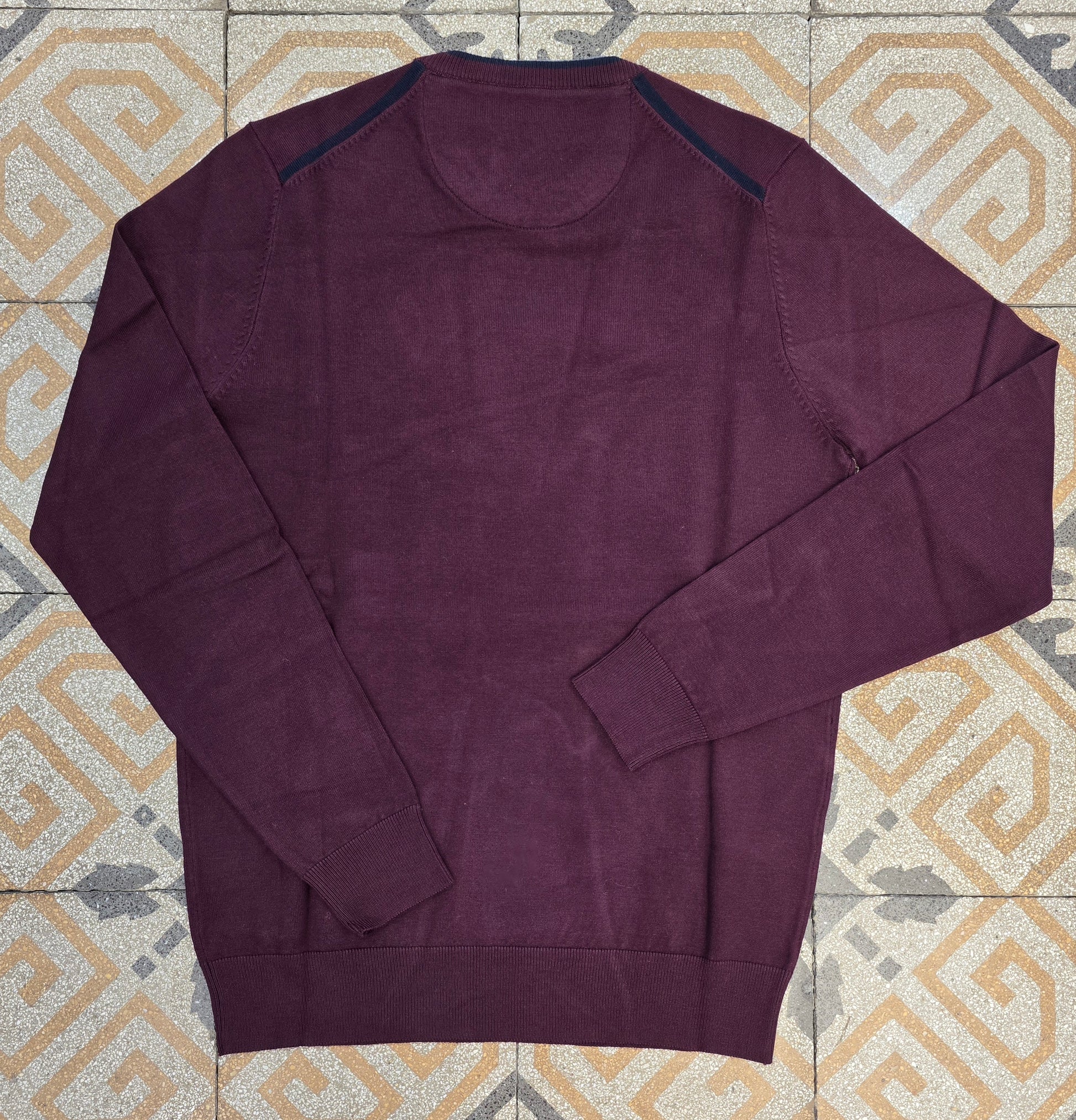 Maglia paricollo in viscosa con toppe a contrasto sui gomiti e doppio colletto.