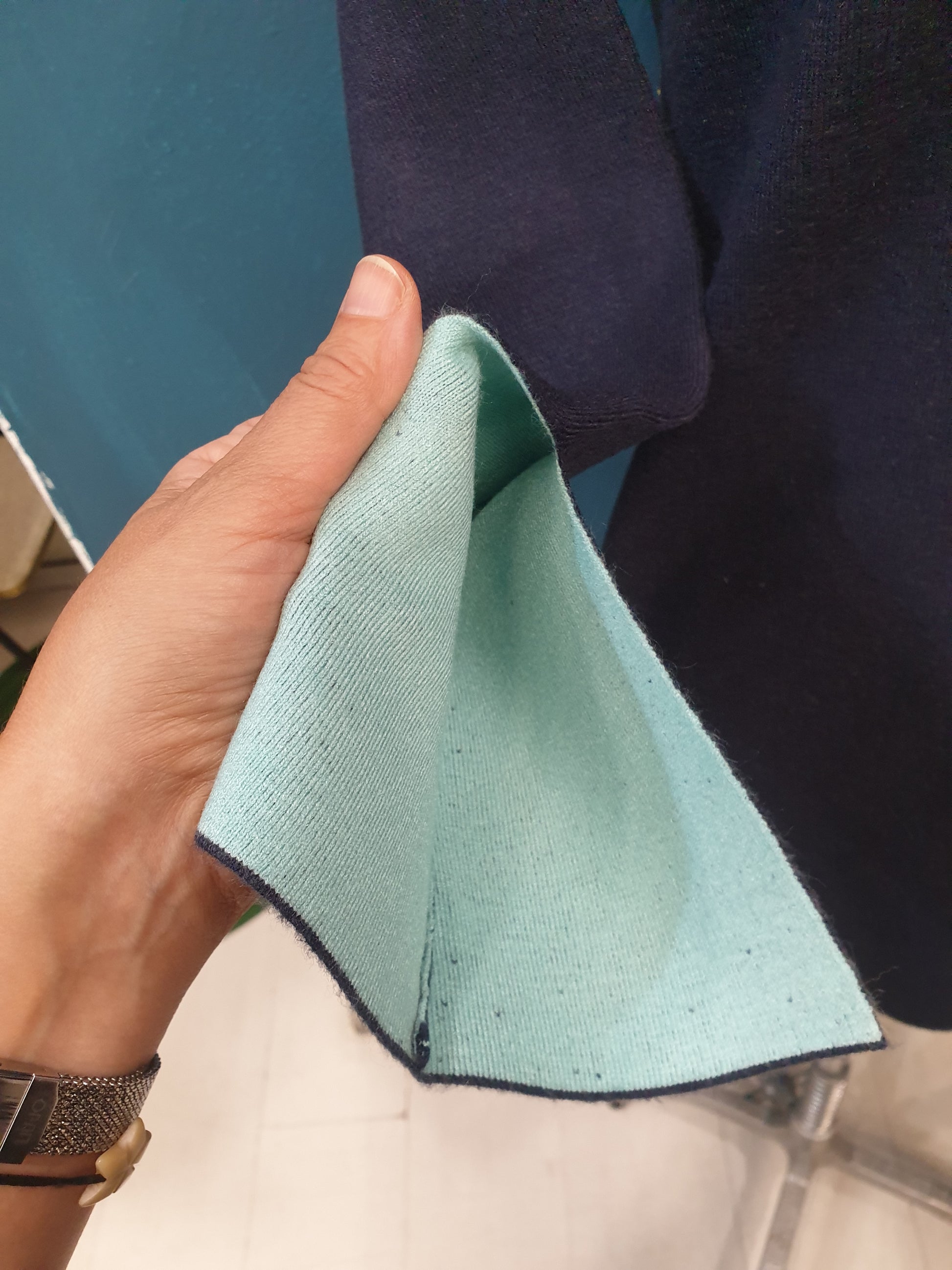 Maglia in magliastoffa di viscosa modello morbido con scollo a V e spacco nel polso colore blu con interno verde acqua