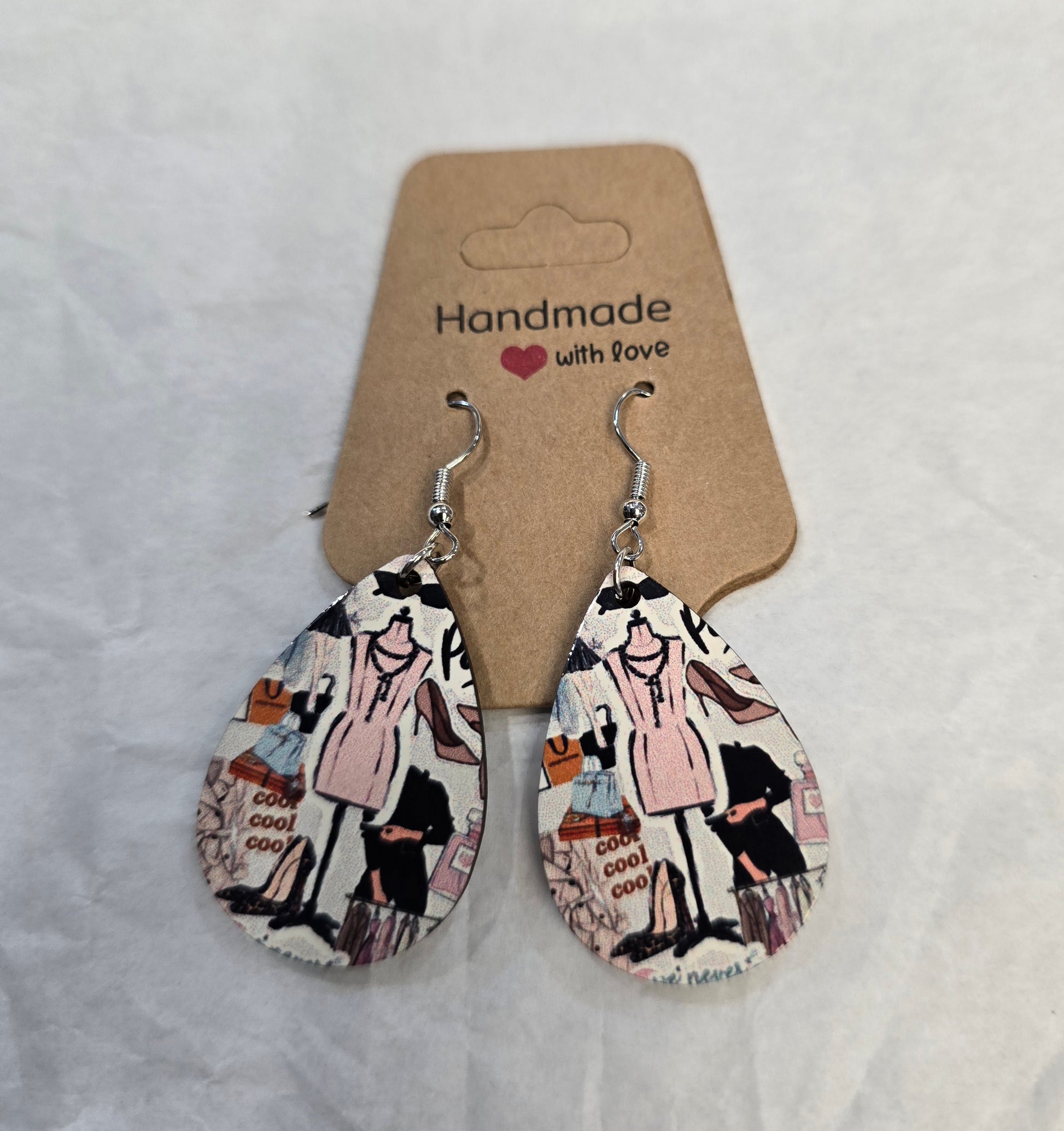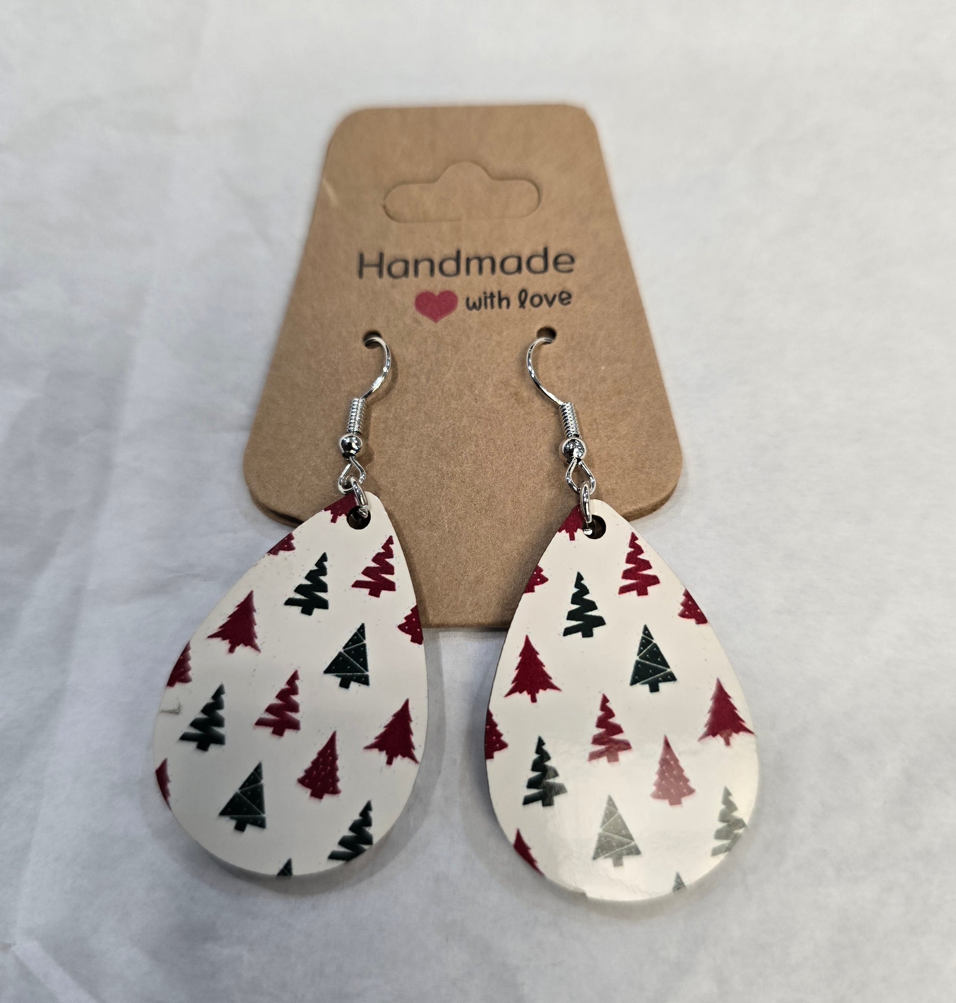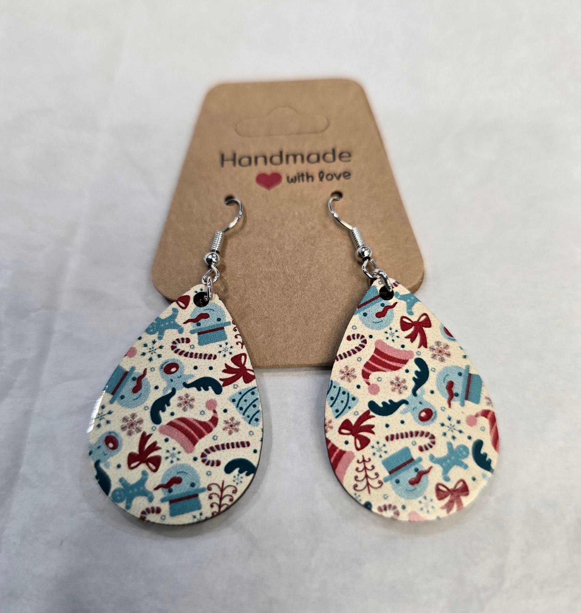 Orecchini in cartone pressato stampato da tutti e due i lati con fantasie natalizie dotato di gancio a monachella argentato da inserire nel buco del lobo con forma a goccia misura 3cm circa molto leggero