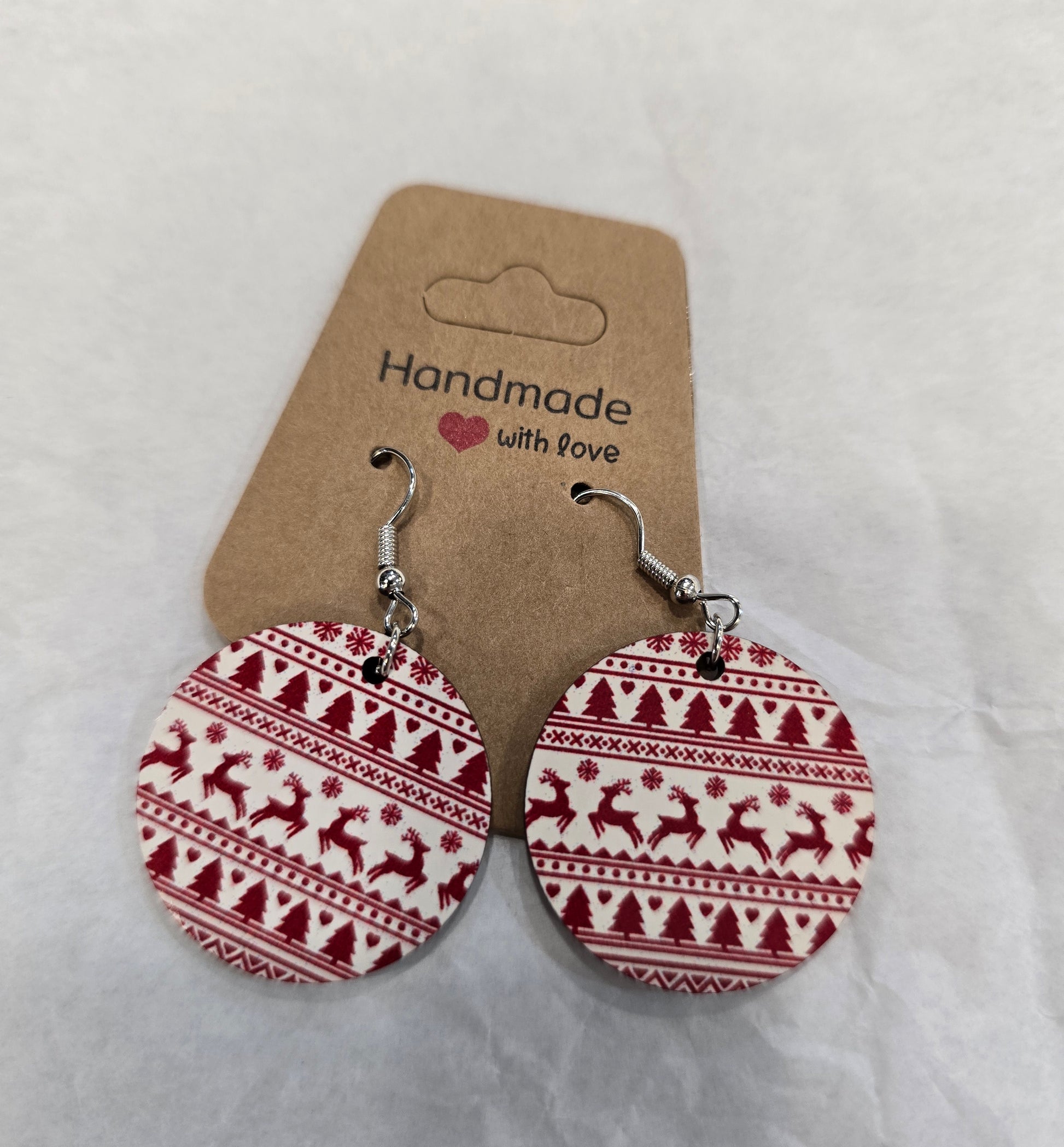 Orecchini in cartone pressato con stampa da entrambi i lati a fantasia natalizia con gancio a monachella argentato molto leggeri di forma rotonda misura 3 cm circa