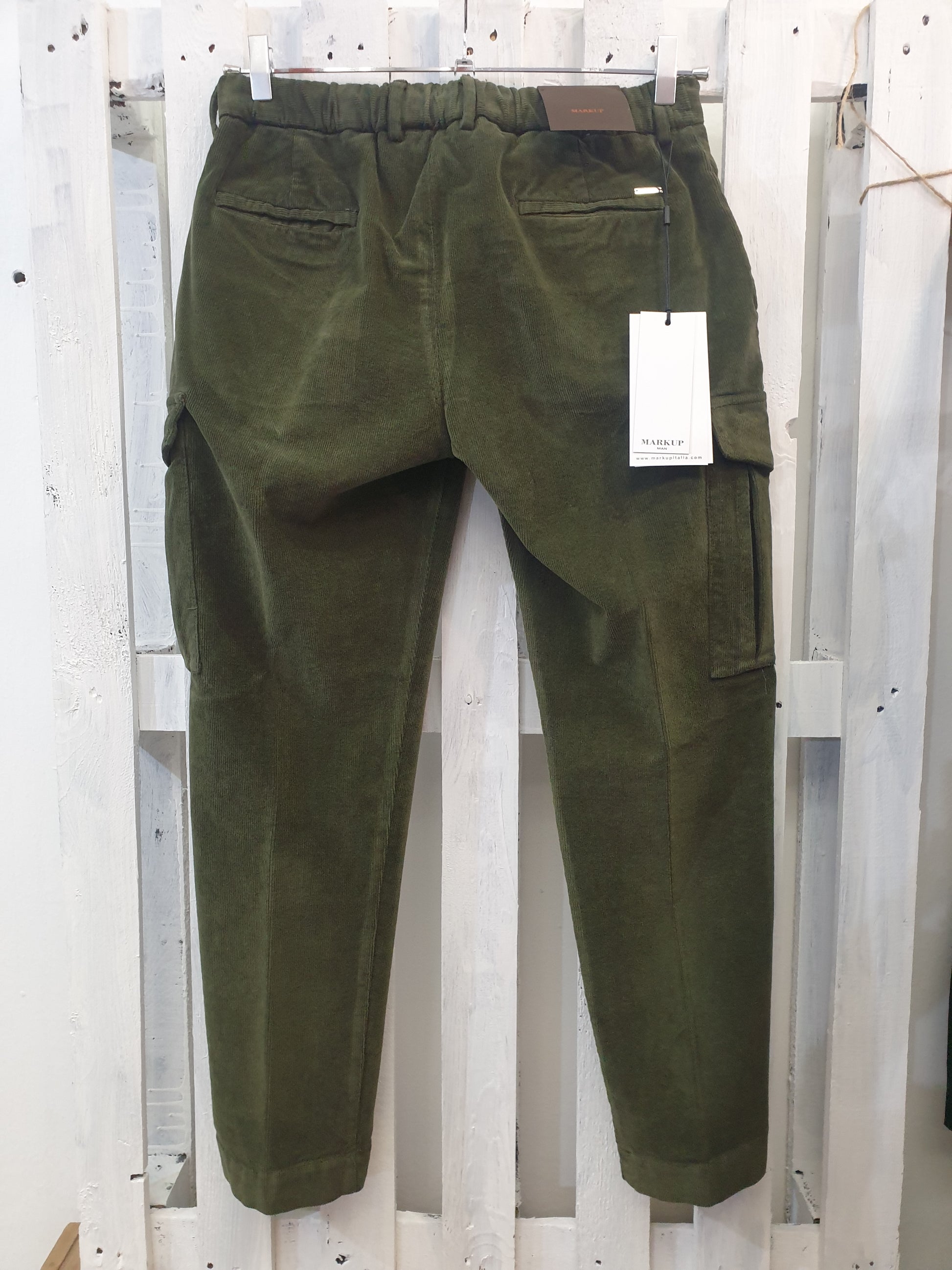 Pantalaccio in velluto millerighe elasticizzato modello cargo con tasca laterale coulisse in vita ed elastico dietro nel cinturino colore verde militare
