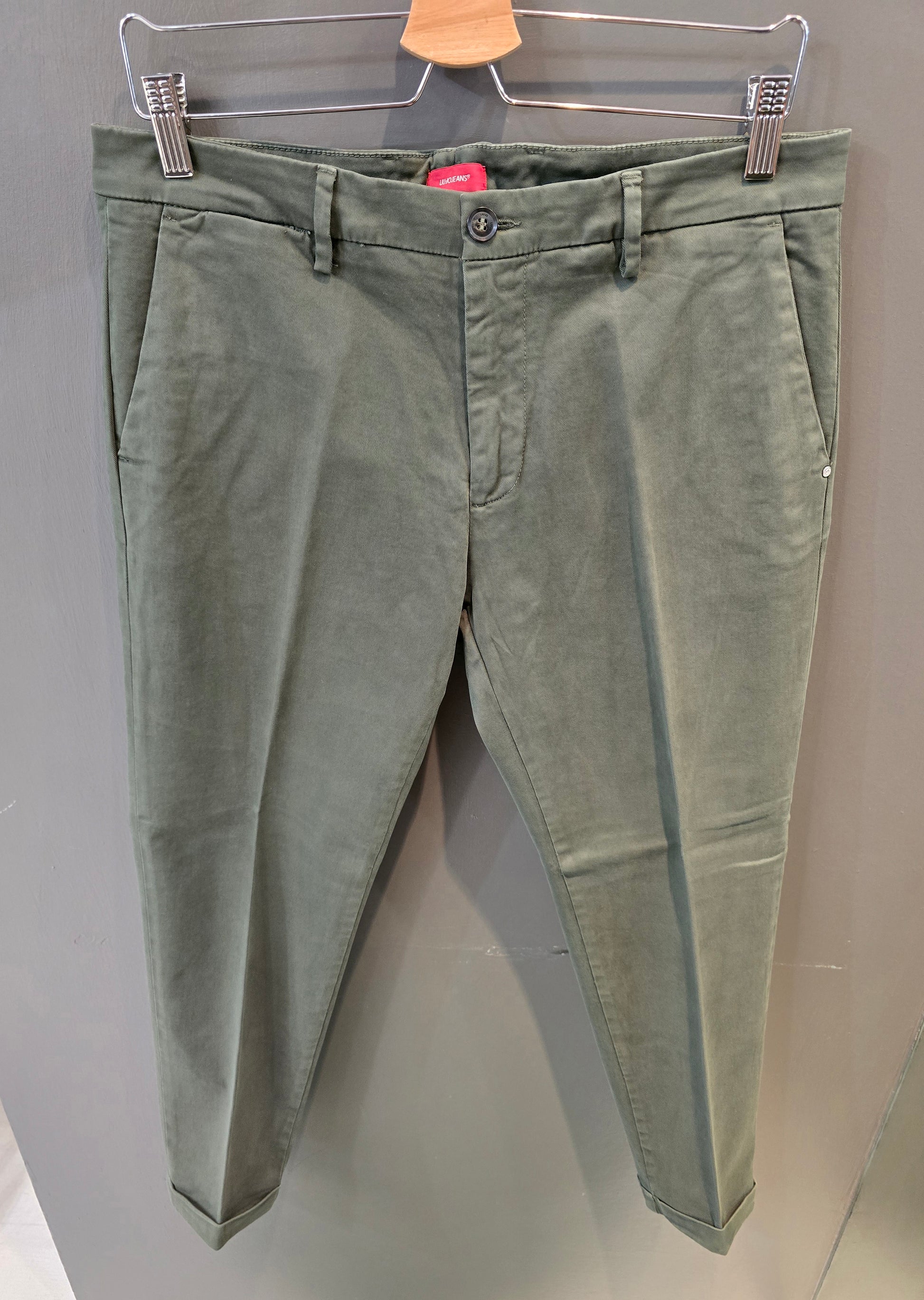 Pantalone chinos in canvas di cotone verde militare con tasche a filetto nel dietro.