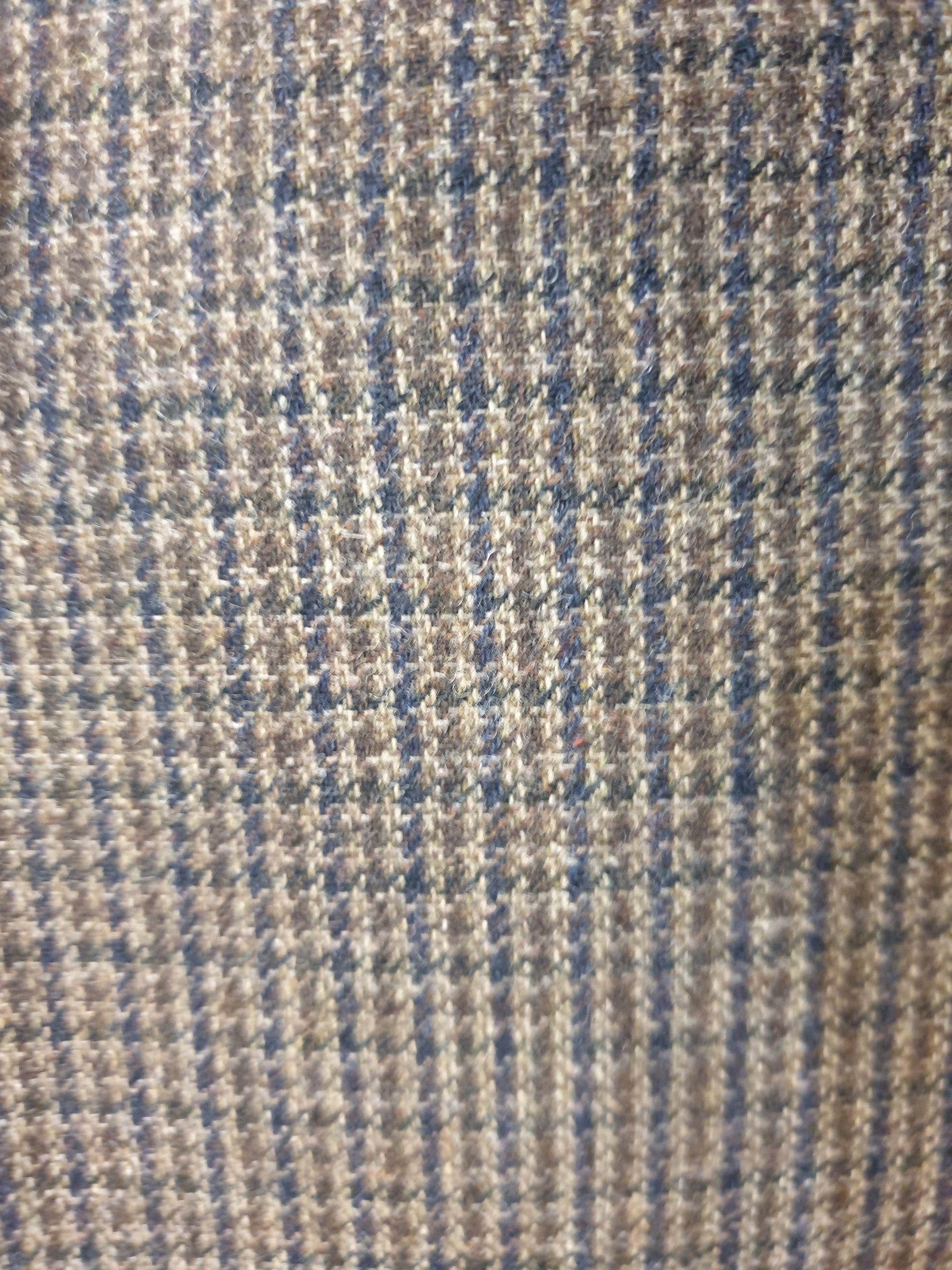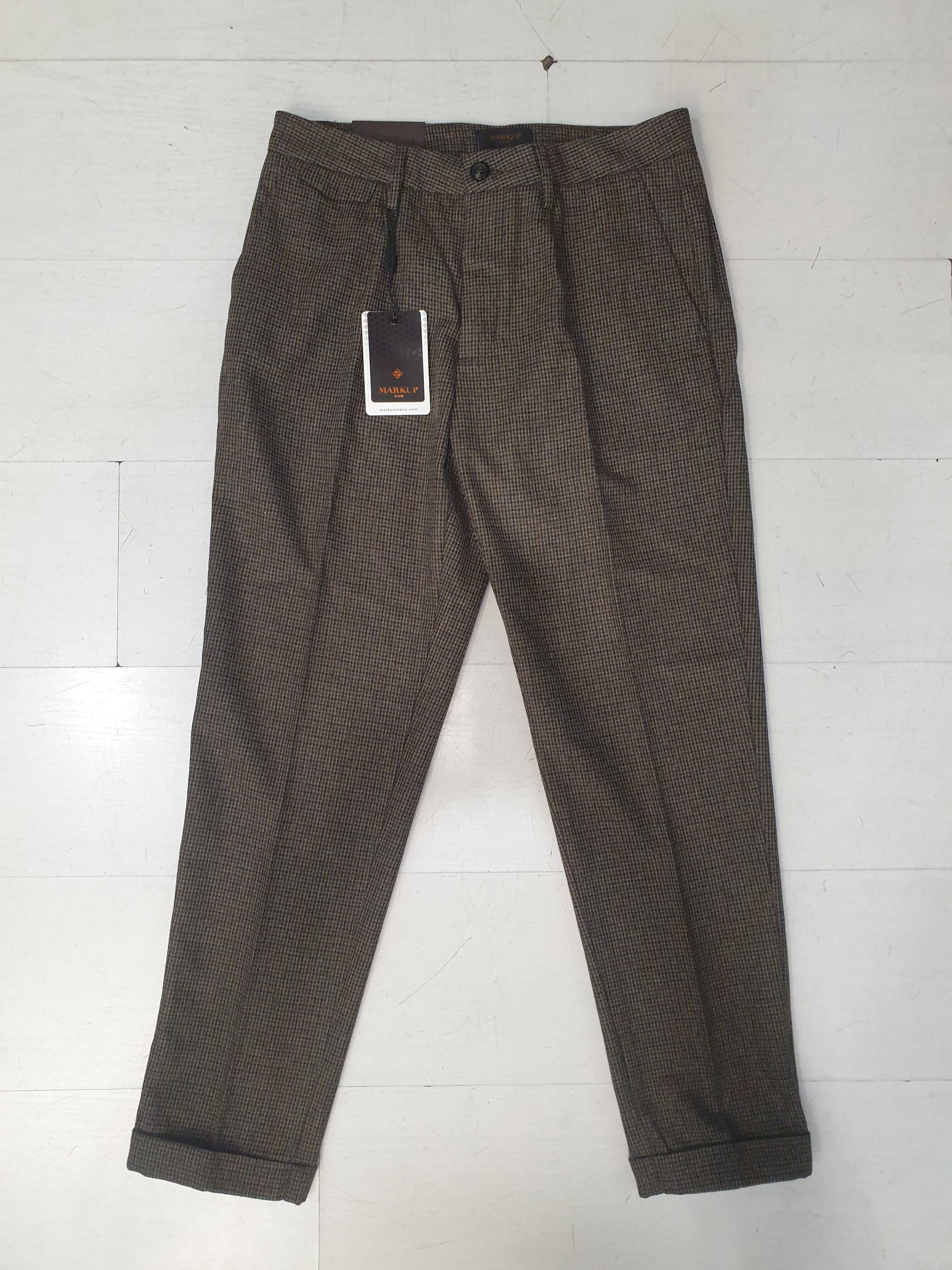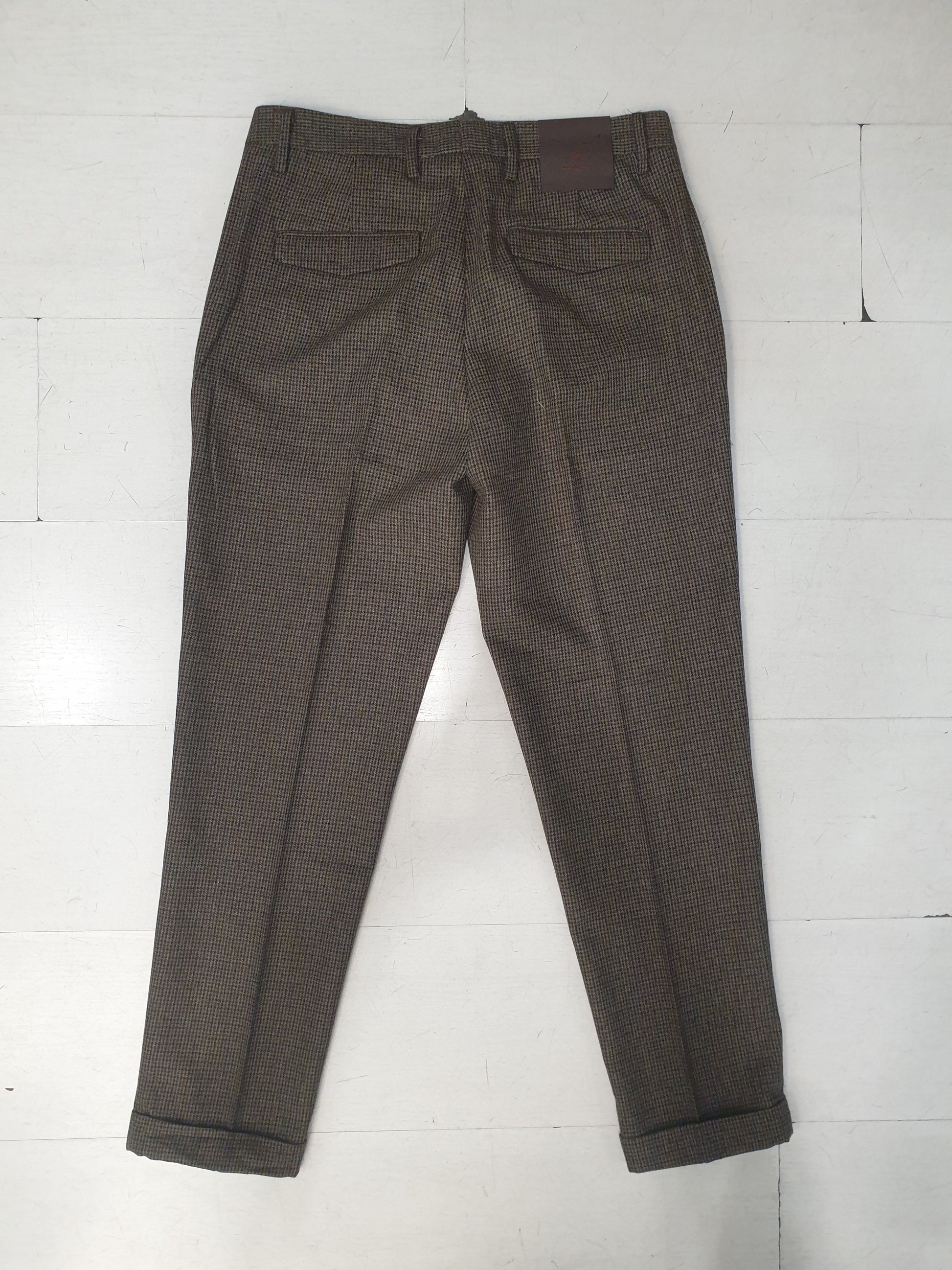Pantalone modello chinos con rovescia in fondo in pannetto mistolana in fantasia piè de pull sui toni marrone