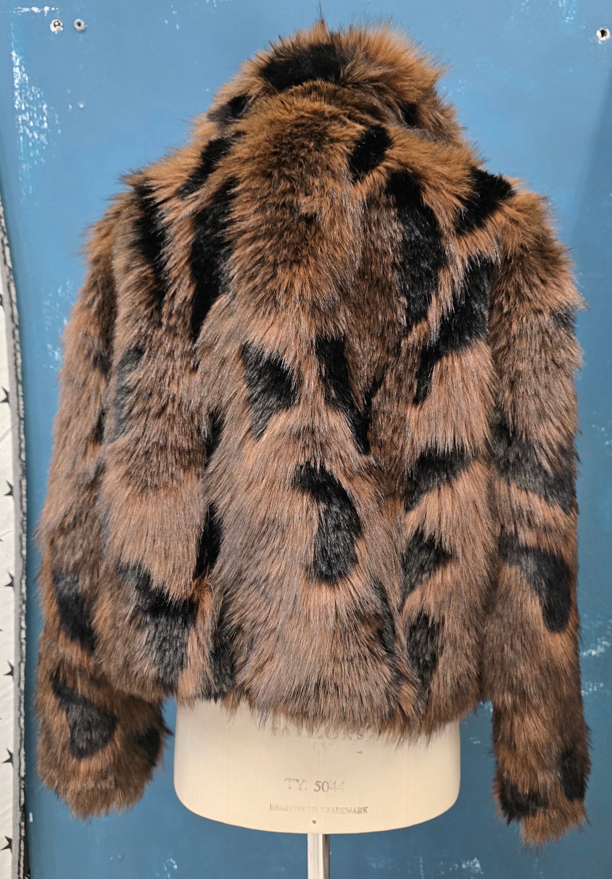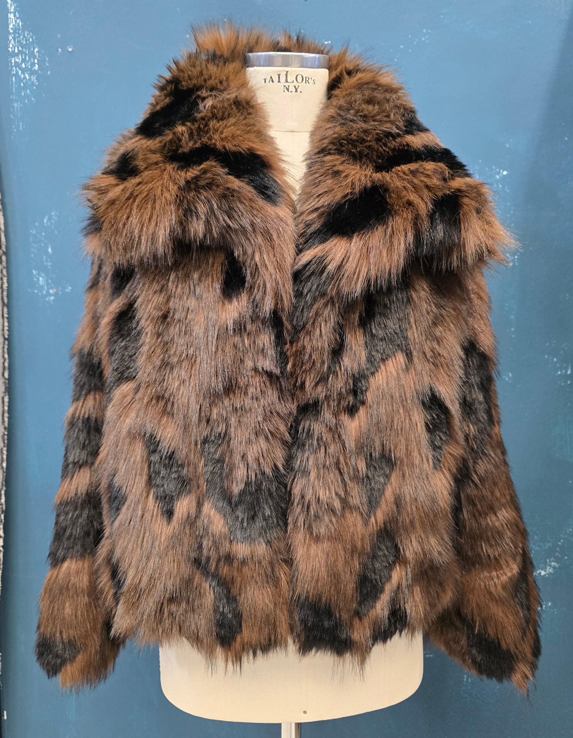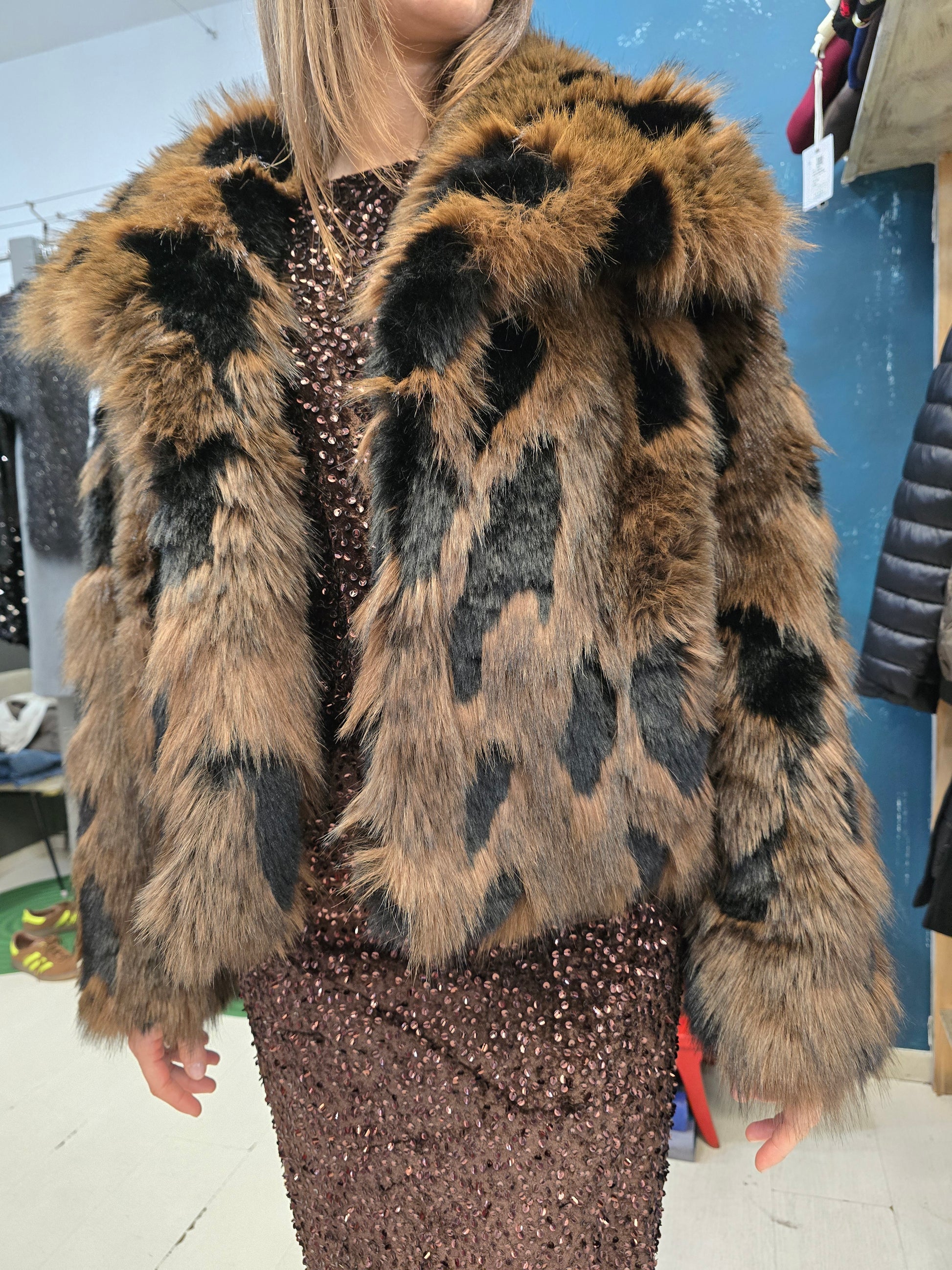 Pelliccia ecologica con effetto chiazzato nero e marrone, taglia unica.