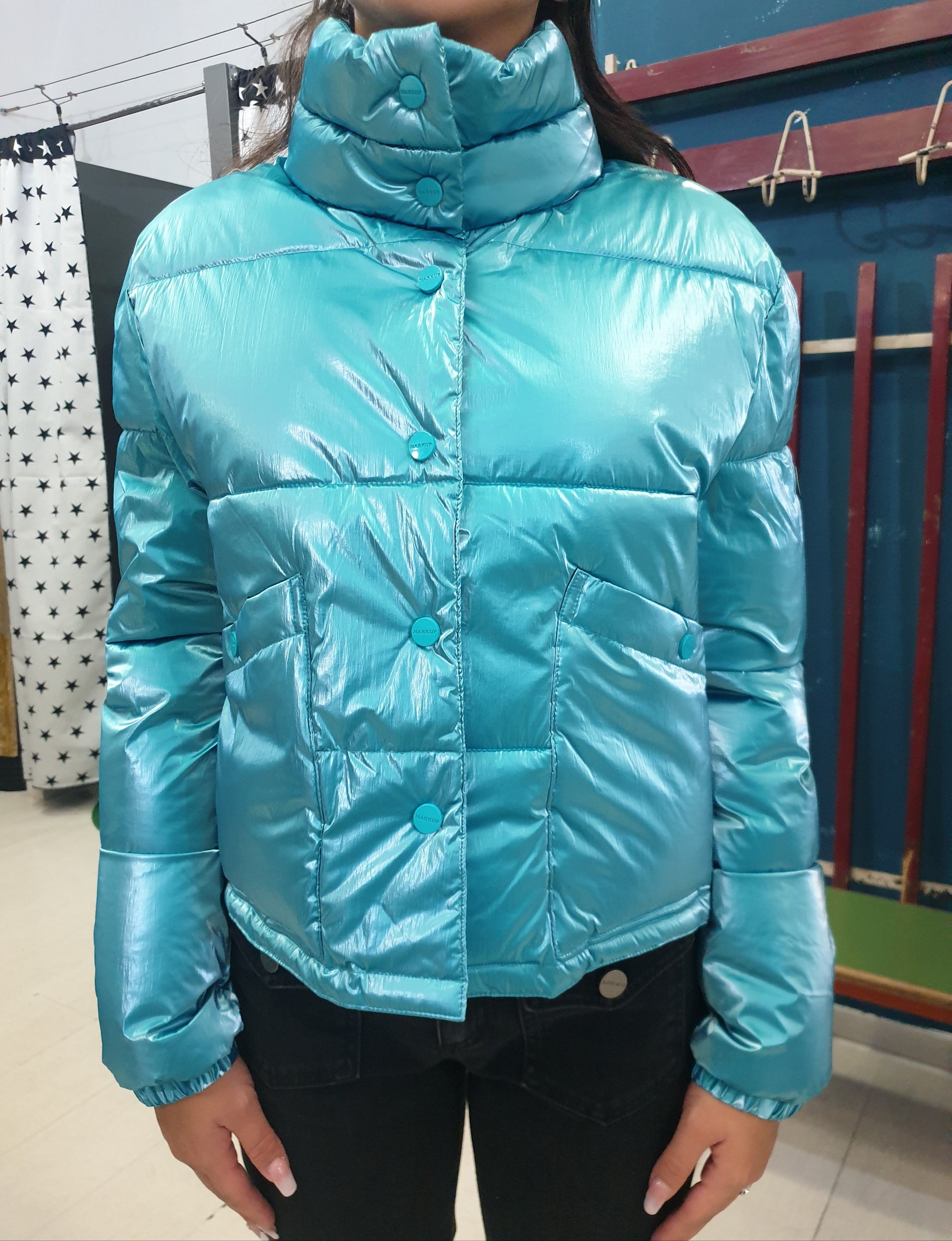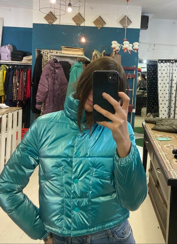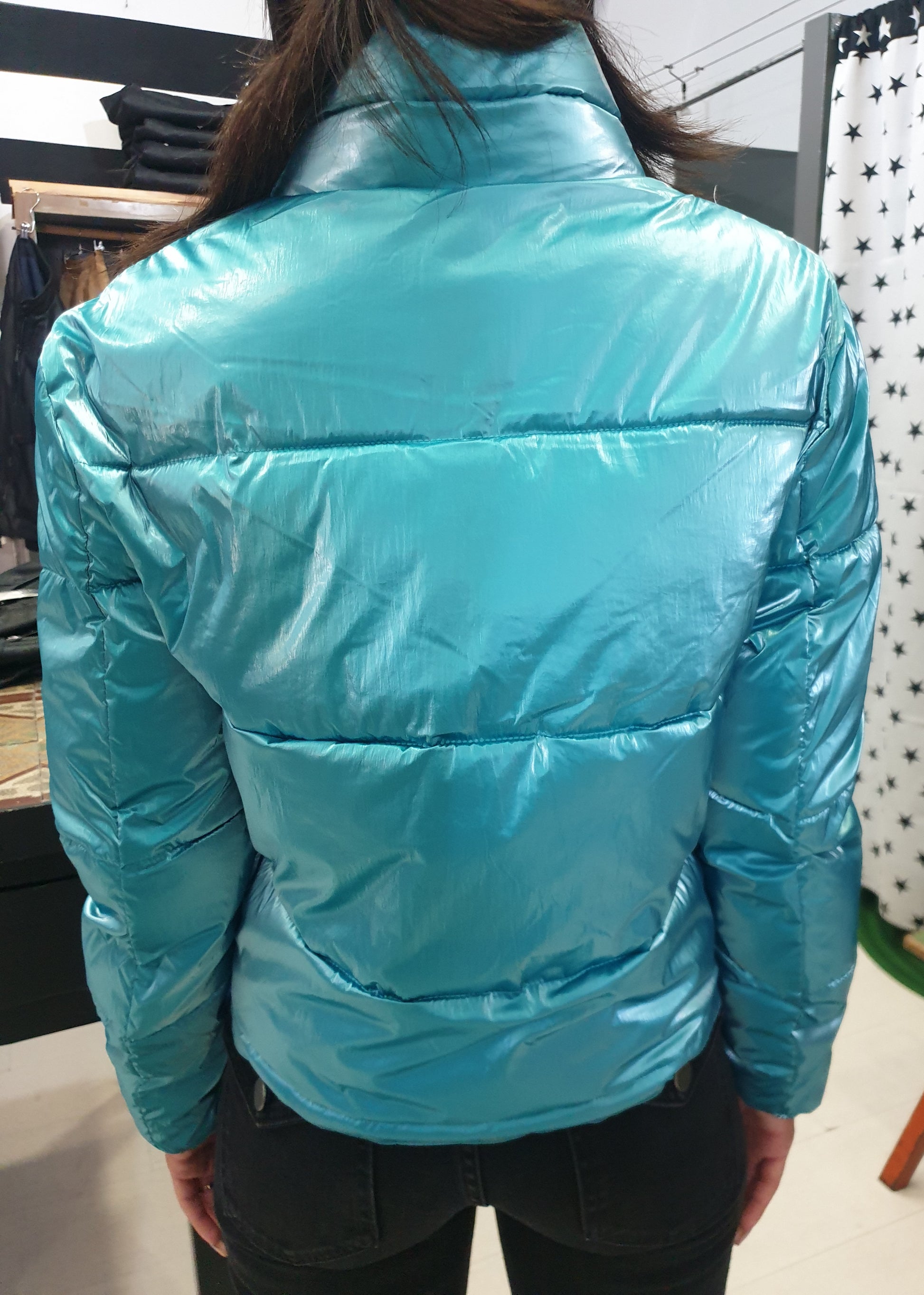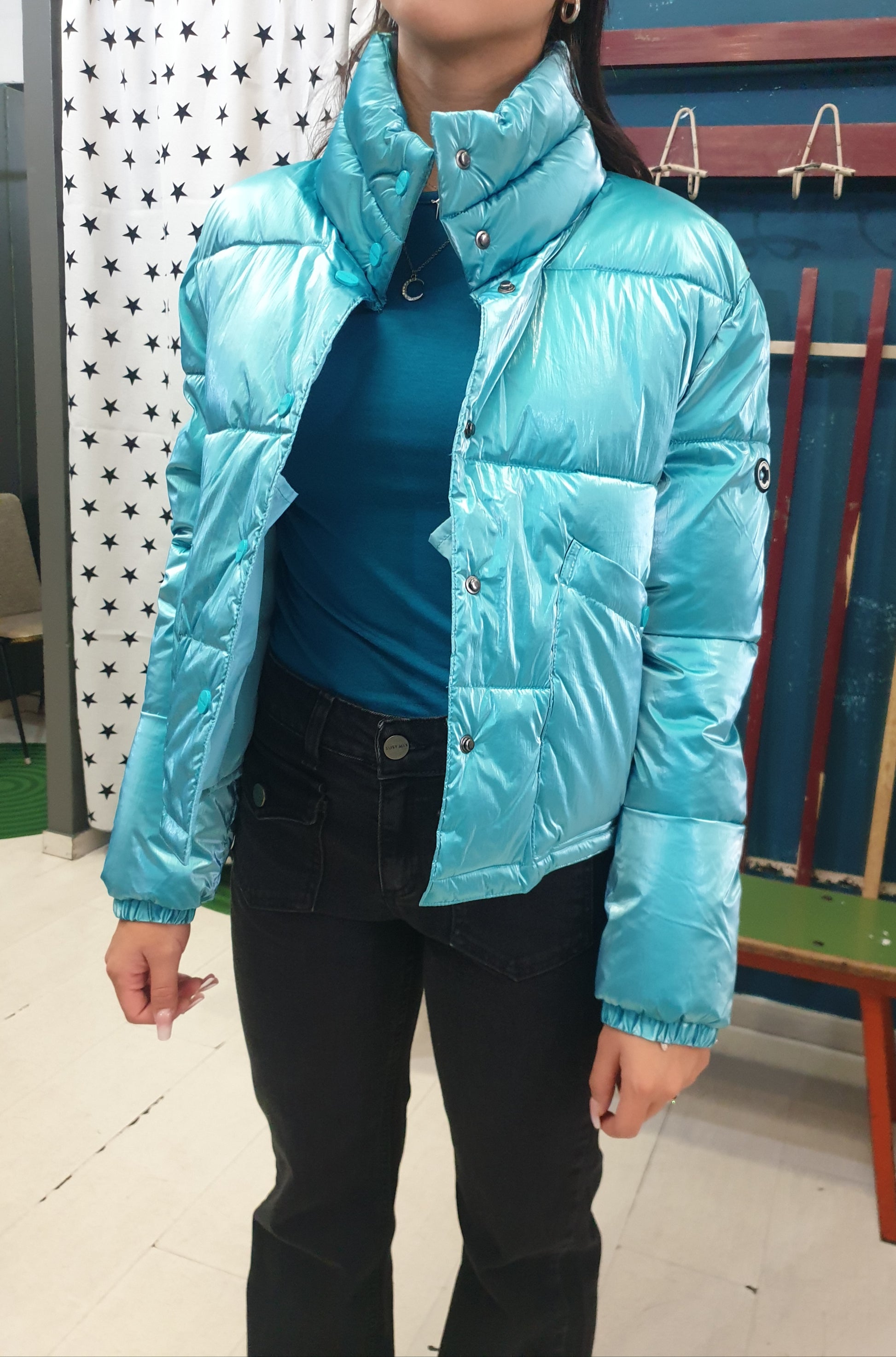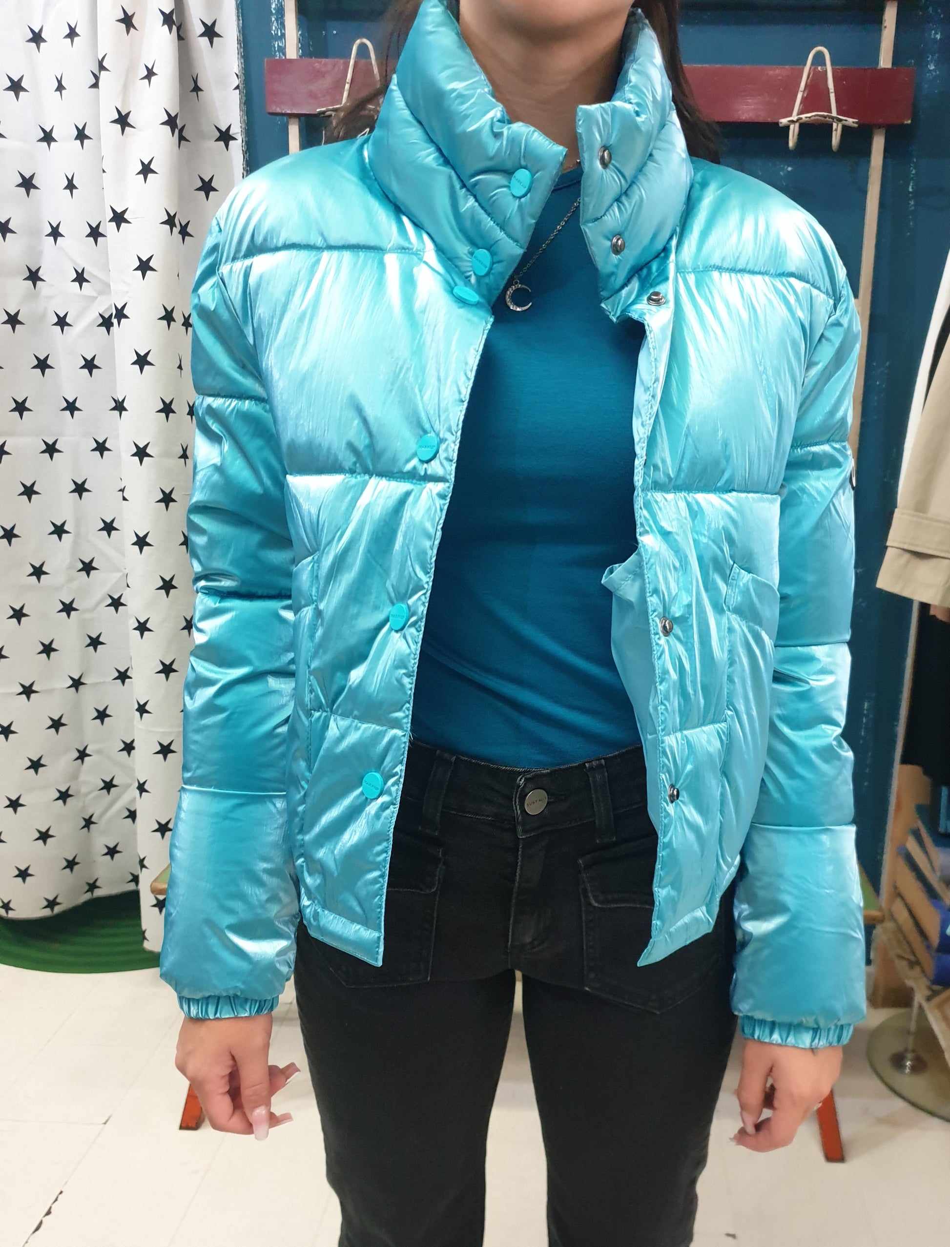Piumino ecologico modello corto in tessuto lucido color tiffany