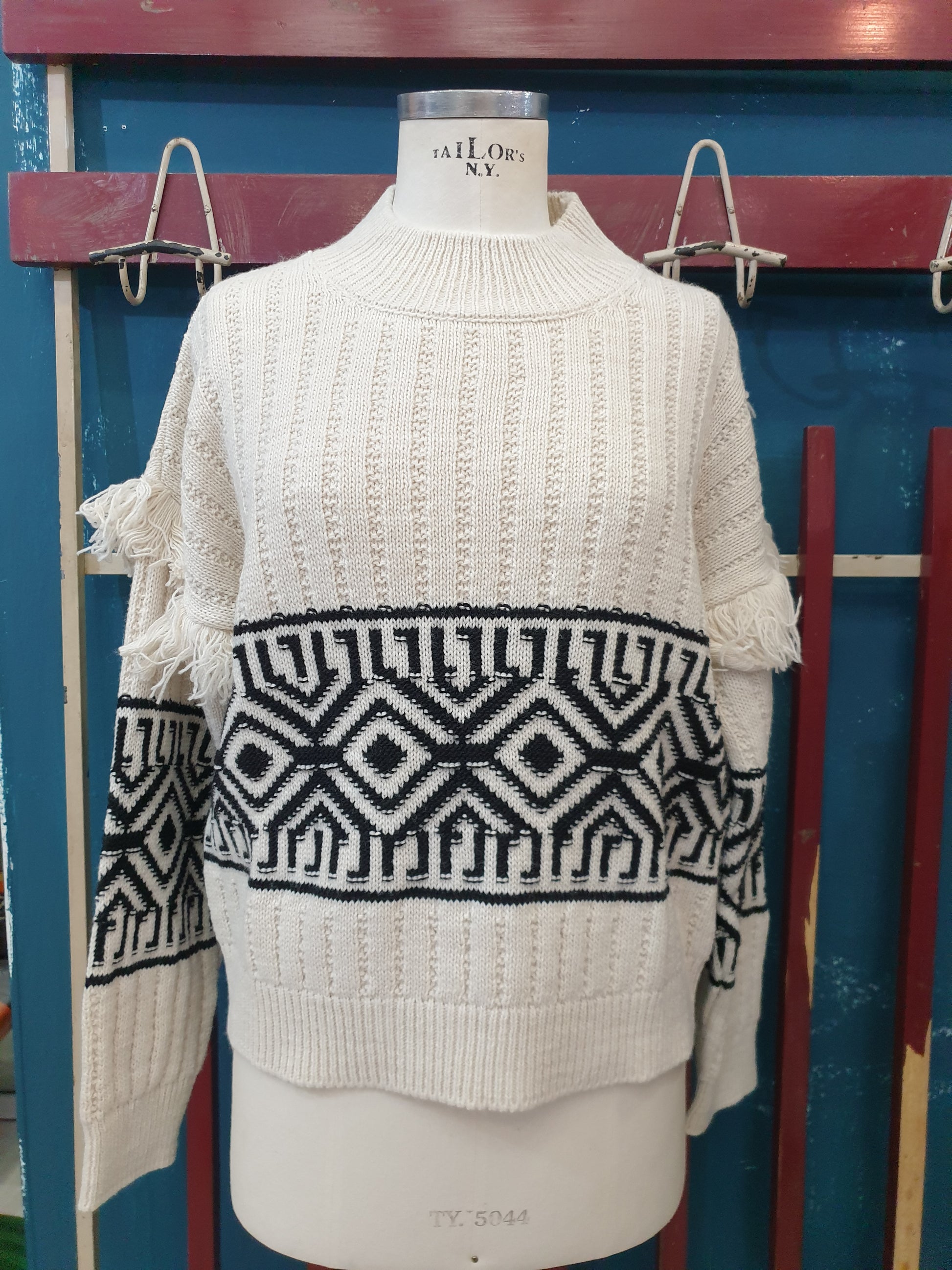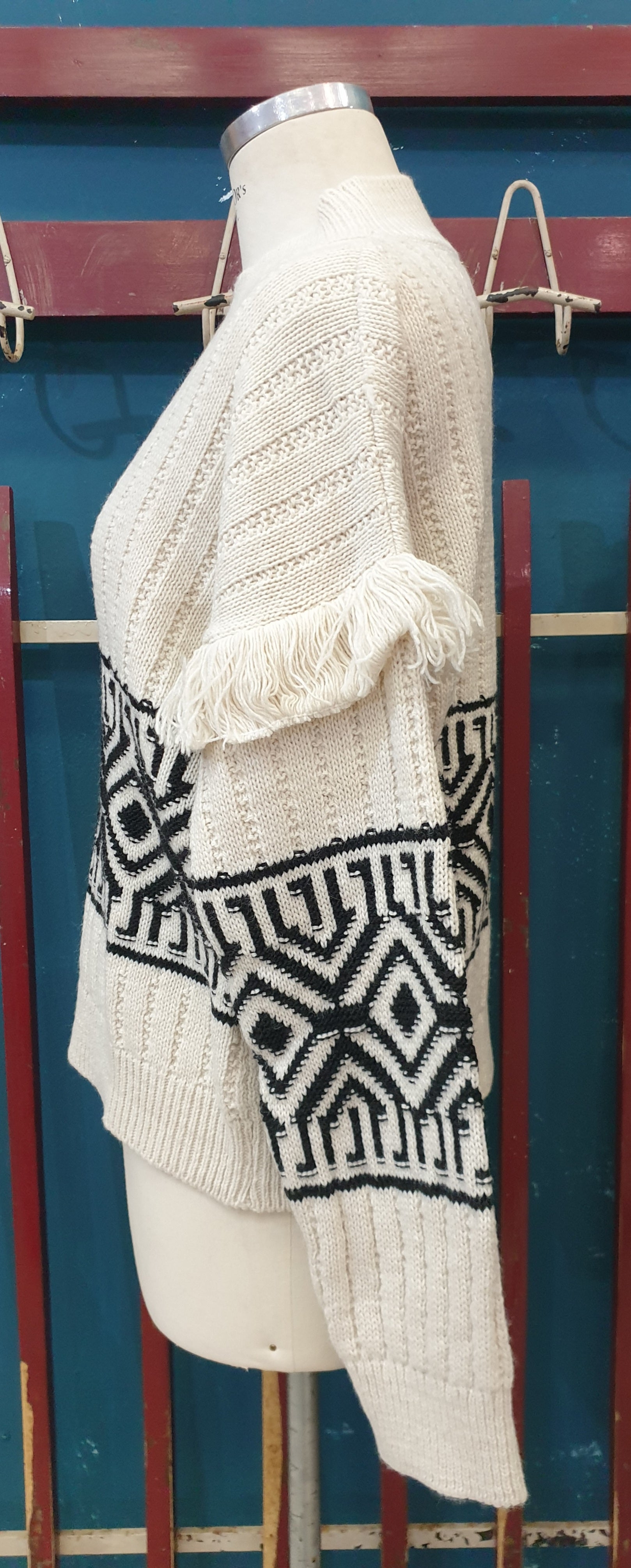 Maglia lavorata a coste con disegni geometrici e frange sulle maniche vestibilità comoda in taglia unica