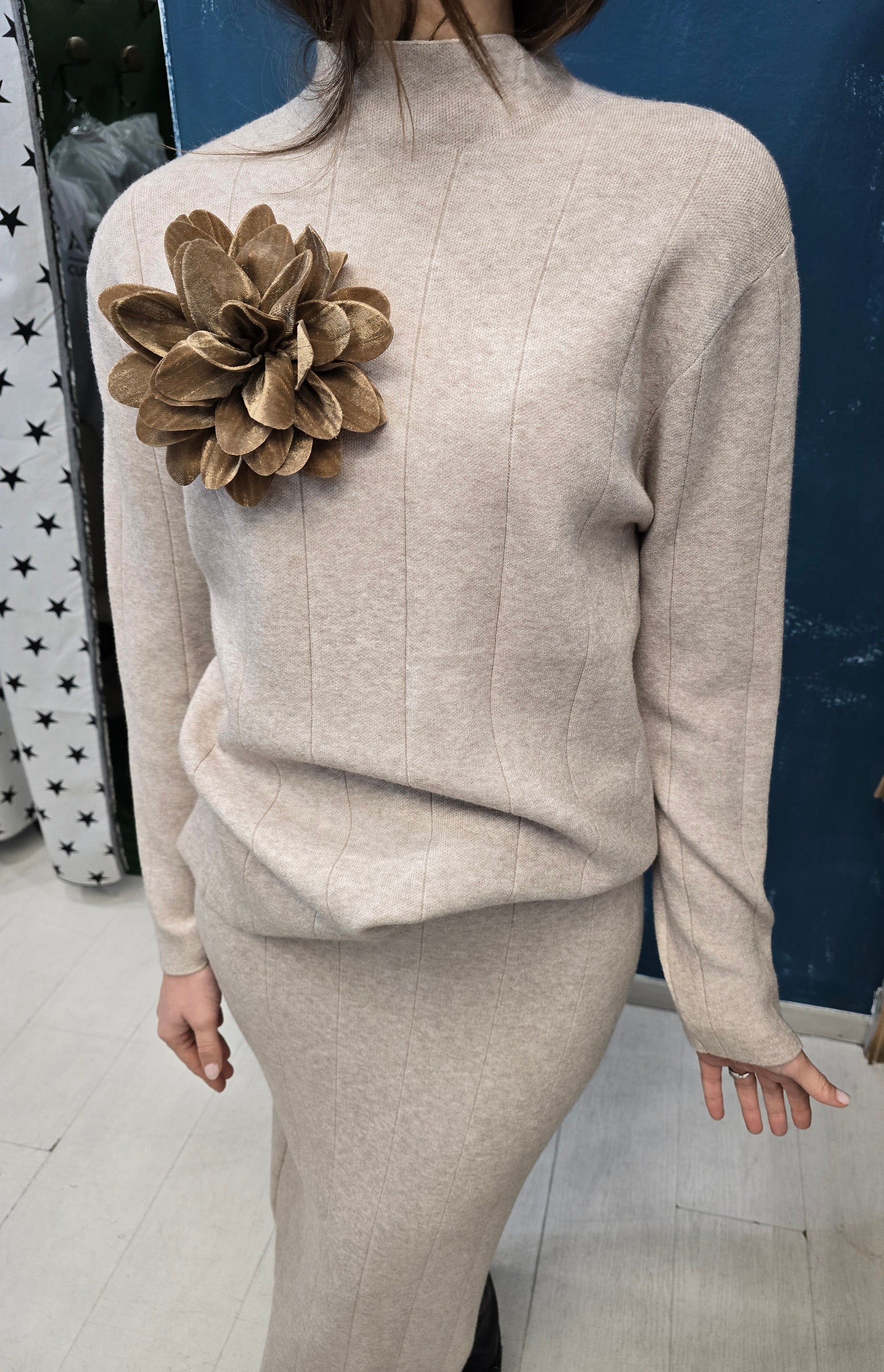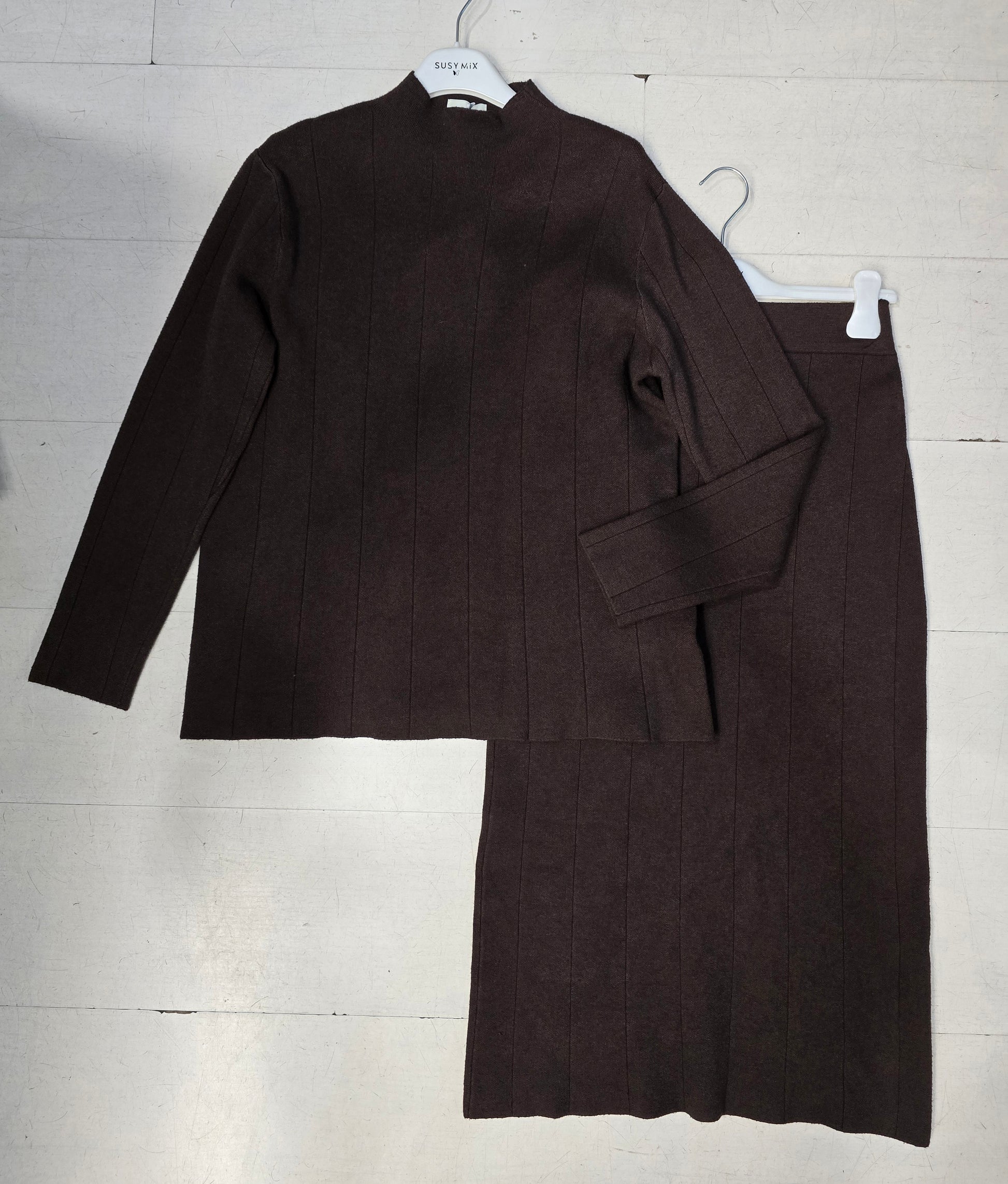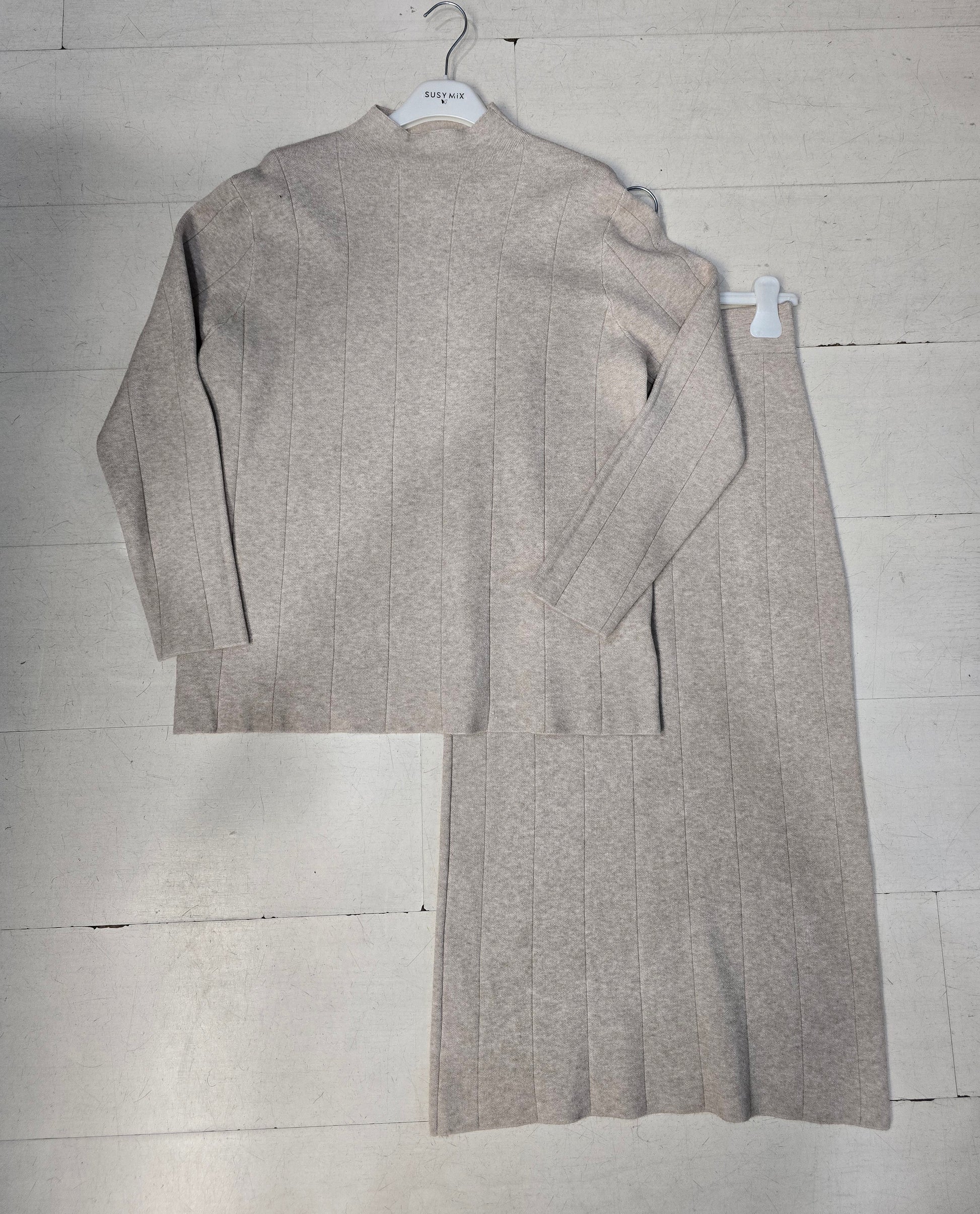 Completo in maglia a costa larga composto dalla maglia con collo a lupetto e con taglio morbido e gonna longuette con elastico in vita a tubino von vestibilità slim in taglia unica con vestibilità fino ad una 48 massima