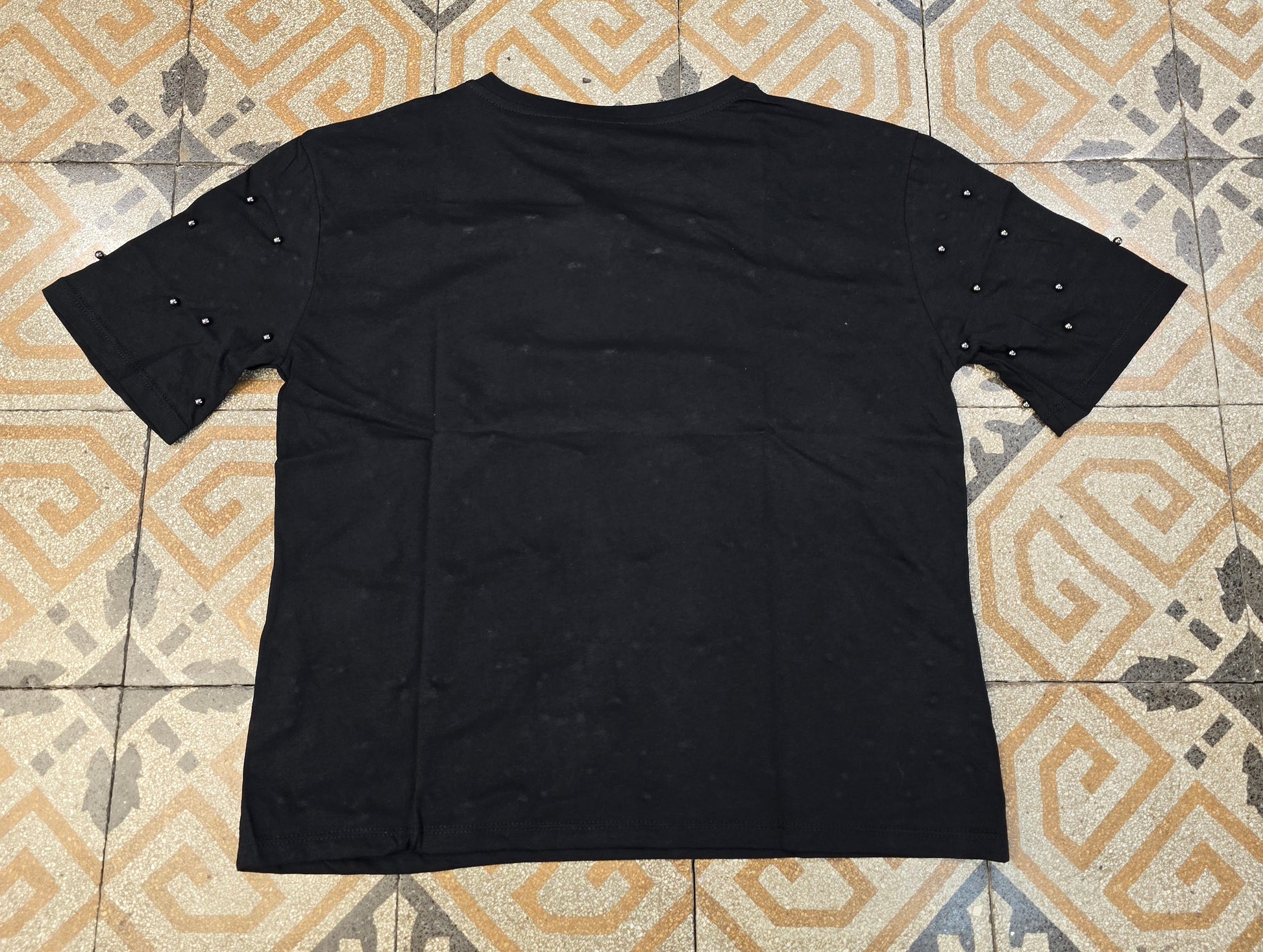 T-shirt paricollo con perle argentate applicate e fantasia a pois, taglia unica.